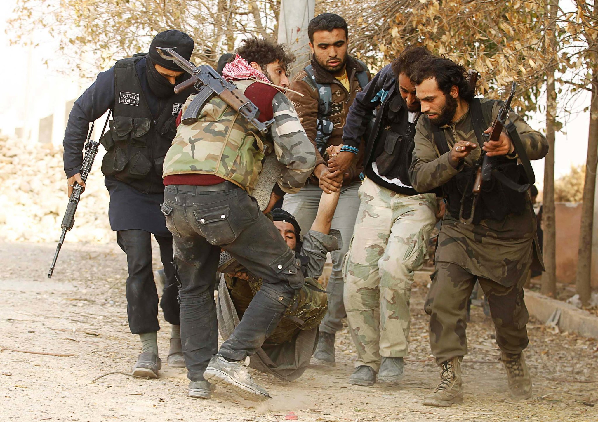 A closer look at the fighter on the far left reveals he is clearly wearing a Jabhat an-Nusra (al-Qaeda) emblazoned vest.