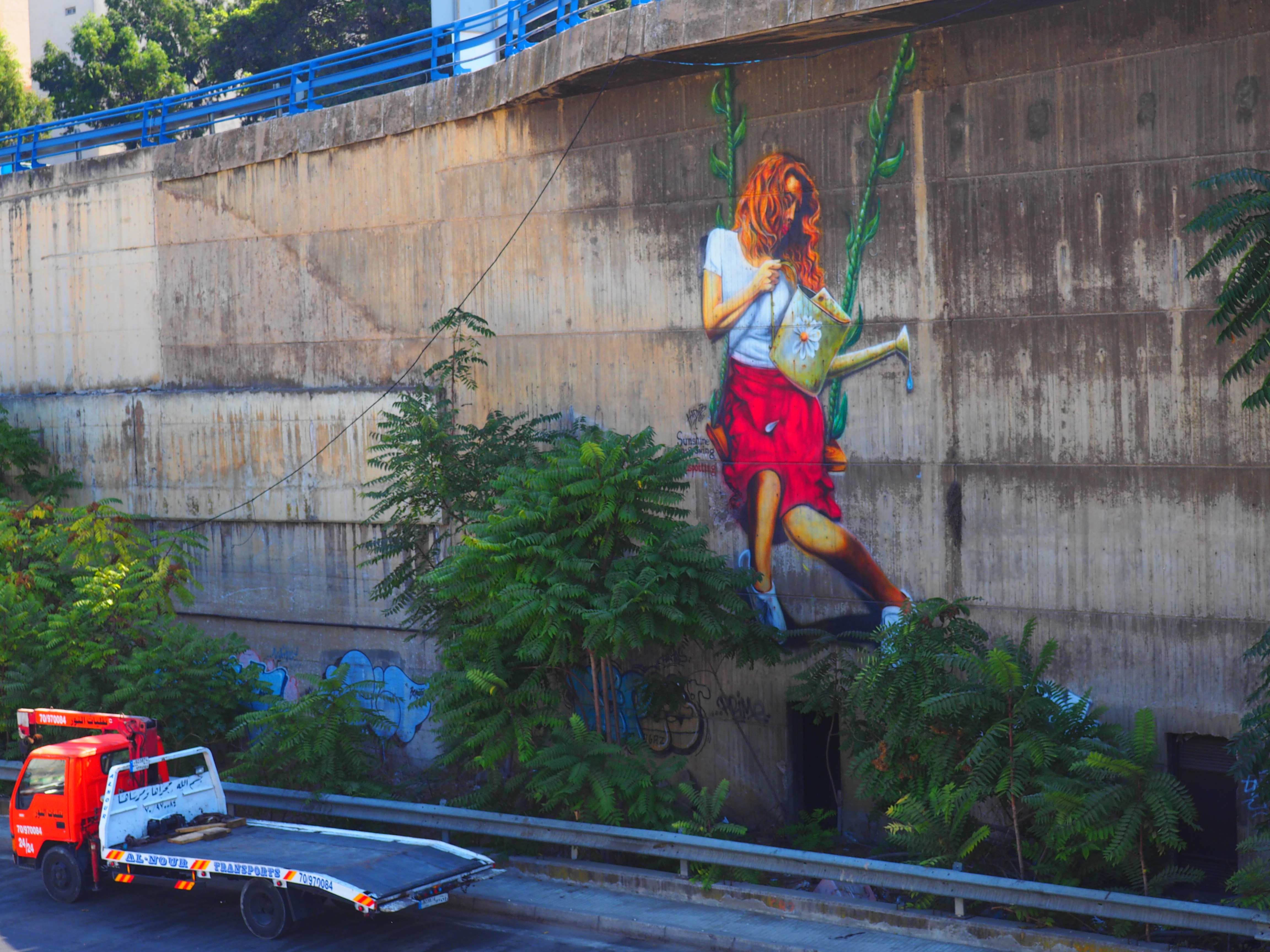 Flowering hibiscus, bougainvillea and tropical weeds struggle from the shadows and corners of the bus station and highway. At the northern end of Al Marfa, a three-story mural by local artist Hadi Beydoun depicts a young blonde in a white top and red skirt, watering the rebellious foliage while swinging from the point where the highway converges into its six churning lanes.