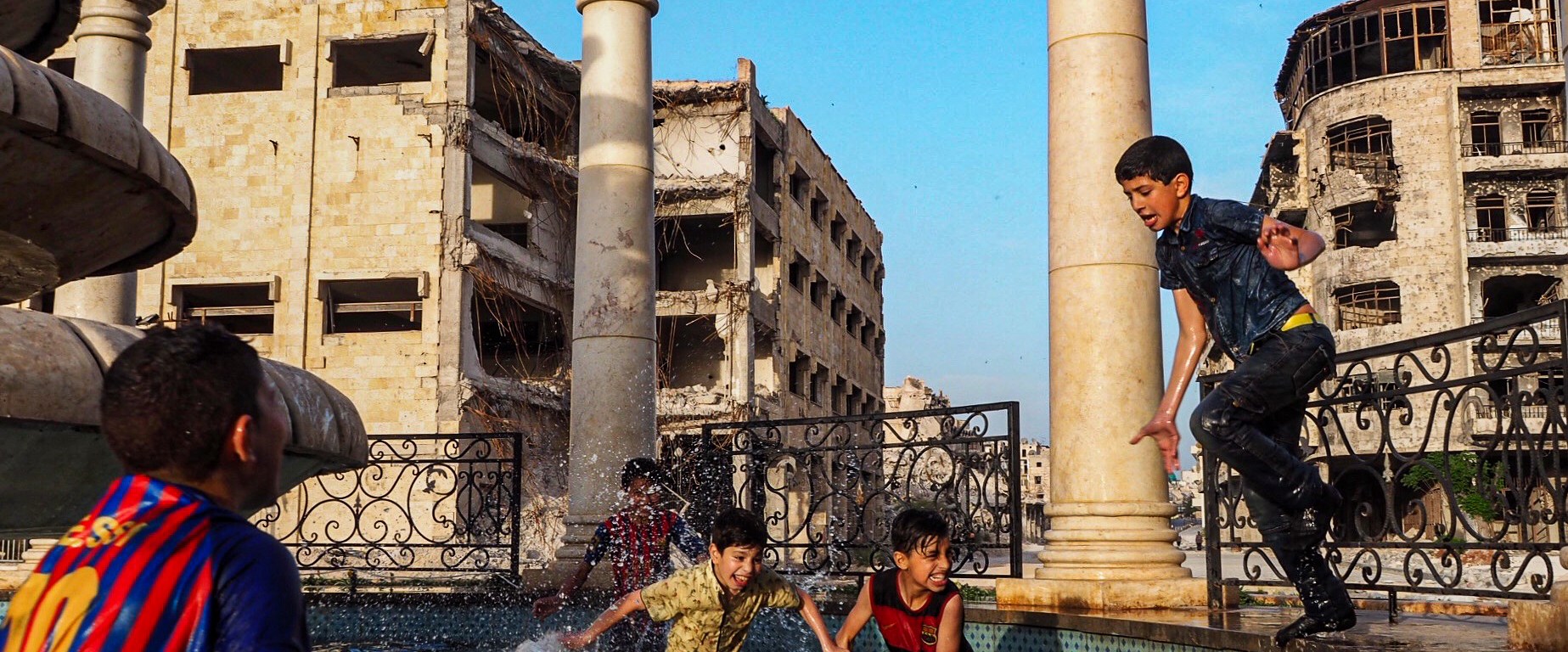 The following afternoon, I waited for Salah behind the Sheraton Hotel, where a once-grand fountain formed a roundabout in the last ‘new’ road before the tangle of ancient lanes began. The baking sun had prompted a gaggle of boys aged between eight and 12 to use the decorative fountain for a more practical purpose as a place to cool off. Dressed in polyester FC Barcelona jerseys and long-pants they performed great leaps from the fountain’s edge, oblivious to the bombed-out buildings surrounding the square. They would never really forget the war that defined their childhood, but for now they still retained the child’s superpower of imagination.