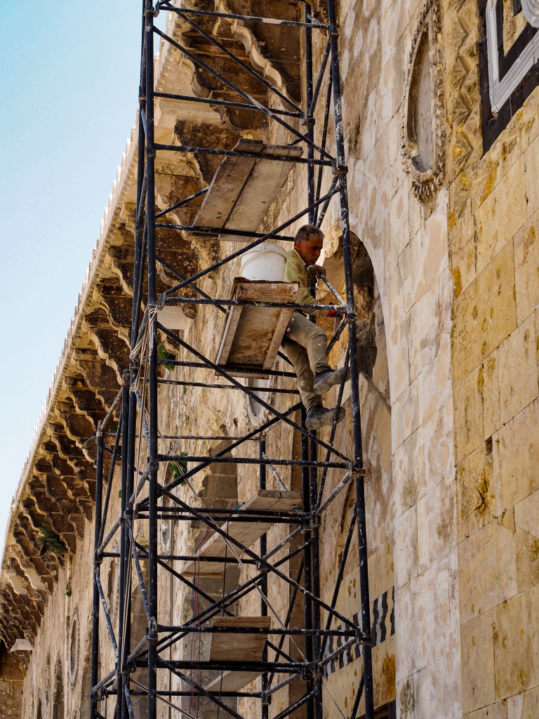 On our first day in Aleppo’s Old City, I watched a small team of woodworkers and stonemasons chip away at the walls of the mosque. I admired the effort they put into a task that would be appreciated for generations. The men – mostly fathers with their sons and nephews – worked their ancient trade with an unquestioning sense of ritual and spirituality. In a barren and sanctioned economy, they were certainly not in it for profit, recognition, or status. The specialised teams were paid little more than subsistence wages. They worked from their hearts, filling each of the thousands of bullet holes with specialised composites developed to match the natural stone. They had laid out and categorised hundreds of blocks from the fallen minaret in the courtyard, ready to be gradually rebuilt.