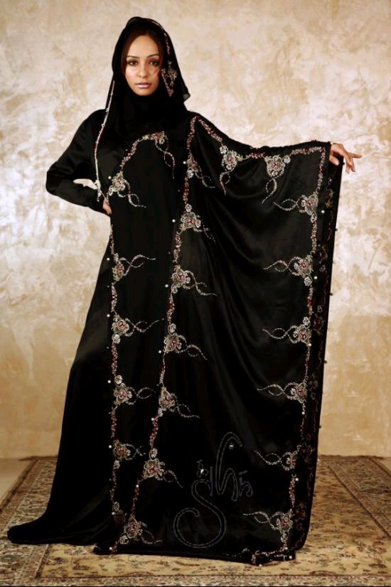 Abaya: Similar to the Jilbab except usually in black only and made from softer materials. These are more “fitted”, though still loose and often have matching hijabs, giving the garment a uniform look. The face is often uncovered. These can vary widely in detail from completely undecorated ones to those garnished with coloured patterns and ‘jewels’. It is this aspect of ‘decoration’ and their slightly form fitting character that makes them less ‘pious’ than a Jilbab in the eyes of some men.